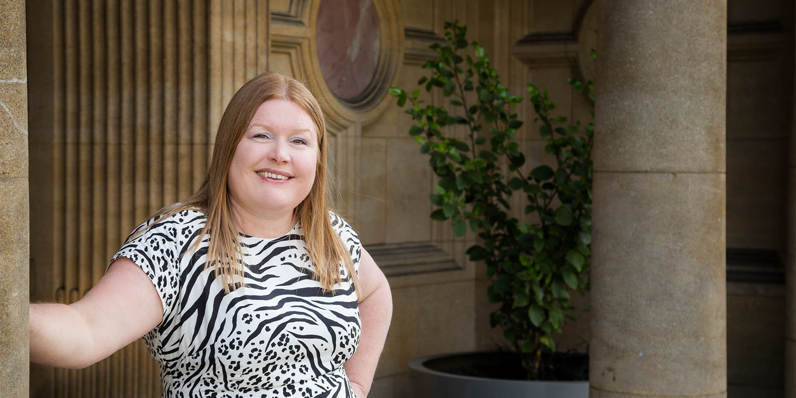 Hannah leaning on stone column